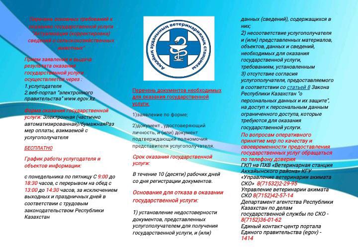 ГКП на ПХВ «Ветеринарная станция Аккайынского района» КГУ «Управление ветеринарии акимата СКО» были разработаны брошюры Перечень основных требовании к оказанию государственной услуги «Актуализация (корректировка) сведений о сельскохозяйственных животных»