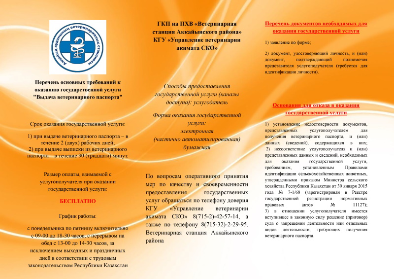 ГКП на ПХВ «Ветеринарная станция Аккайынского района» КГУ «Управление ветеринарии акимата СКО» были разработаны брошюры Перечень основных требований к оказанию государственной услуги «Выдача ветеринарного паспорта»