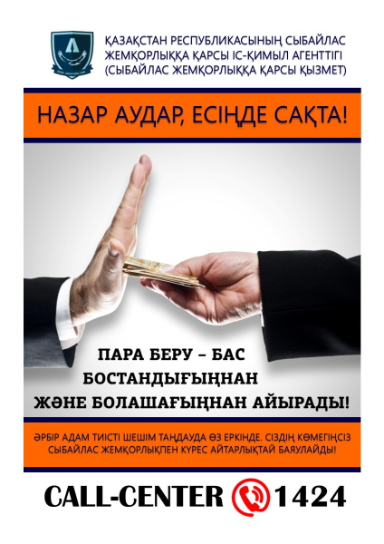 Егер Сіз мемлекеттік қызметтерді алу кезінде сыбайлас жемқорлық көріністеріне тап болсаңыз, онда Сізге бұл факті туралы ұлттық қауіпсіздік органдарына, прокуратураға немесе Call-центр 1424 сыбайлас жемқорлыққа қарсы қызметіне хабарлау қажет.